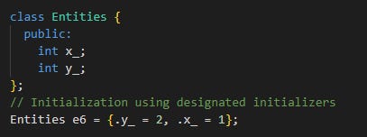 C++20 introduced designated initializers, which allow for initializing structs and arrays in a more readable and maintainable way. For example, struct A { int x; int y; } a = {.y = 2, .x = 1};