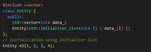 C++11 also introduced the concept of initializer lists, which allows for initializing objects of container classes, such as std::vector, std::array, and std::initializer_list. For example, std::vector<int> v{1, 2, 3};