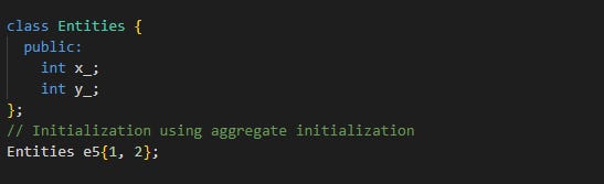 C++11 introduced the concept of aggregate initialization, which allows for initializing structs and classes that have no user-defined constructors, virtual functions, private members or base classes. In other words, an aggregate class is a class with no user-provided constructors, no private or protected non-static data members, no base classes and no virtual functions. For example, struct A { int x; int y; }; A a{1, 2};