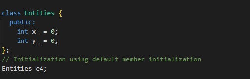 C++11 introduced the ability to initialize class members with a default value. This eliminates the need to initialize members in the constructor's initializer list. For example, class A { int x = 0; };